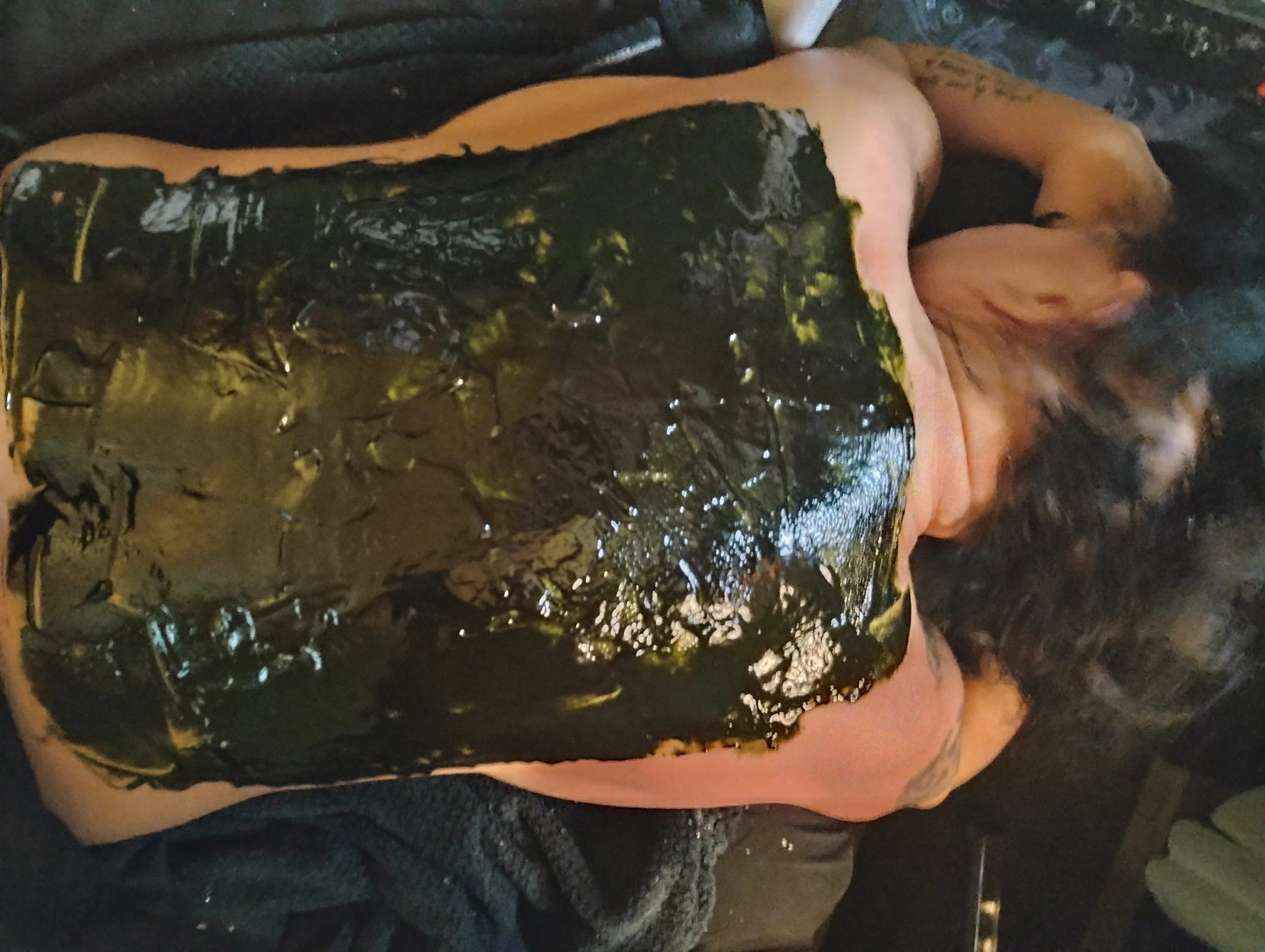 Start with a deep cleanse then the body is wrapped with detoxifying charcoal, seaweed, mud mask, retinol blend, or enzyme wrap of your choice and tightly bound around the whole body with a heated blanket to allow the area to truly and completely absorb all of the wonderful benefits that are usually washed down the drain, then the mask is removed with oversized steam towels and the treatment concludes with serums and a deep conditioning lotion of your choice.