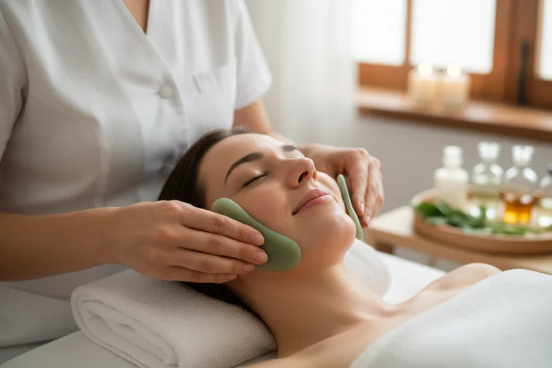 Using a cooling jade stone to target points on the face and neck to eliminate tension and toxins and reduce puffiness creating a sleek and chiseled jawline and detoxifying the body. Can be done on face and whole body.